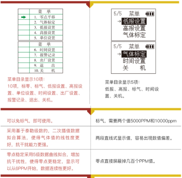 | 被测气体 | 测量范围 | 可选量程 | 分辨率 | 报警点 |